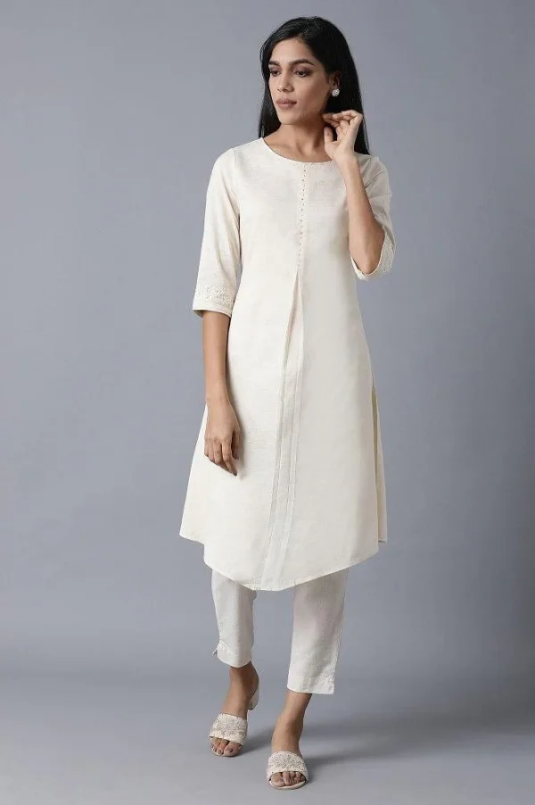 Ecru khadi kurta with embroidered sleeves and centre dipped hemline in round neck and regular three-quarter sleeves.