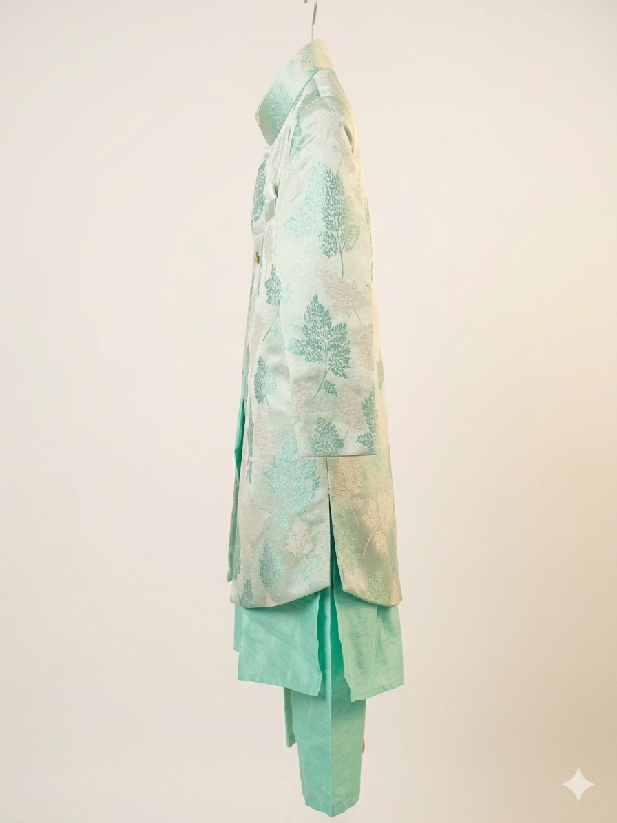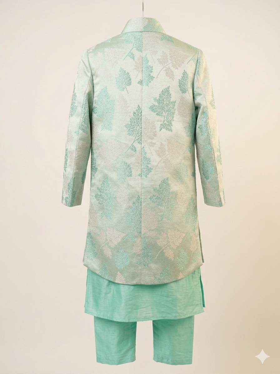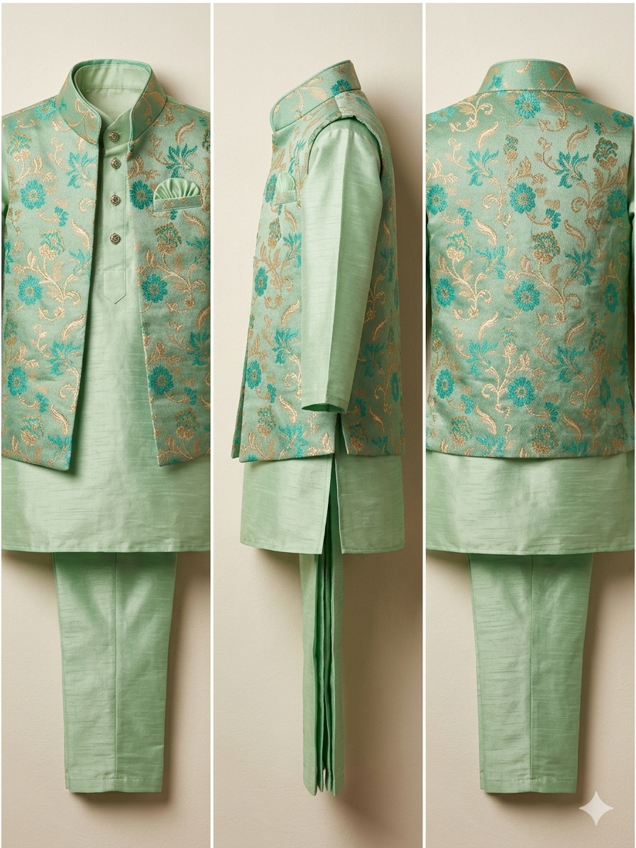 Complete 3-Piece Festive Outfit: Includes a solid-toned kurta with mandarin collar, slim-fit matching pants, and a designer ethnic jacket,