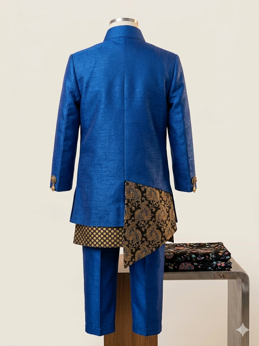 Exquisite Jacquard Jacket: Features a designer open-front jacket with vibrant circular jacquard motifs and a matching pocket square for a regal, layered look.