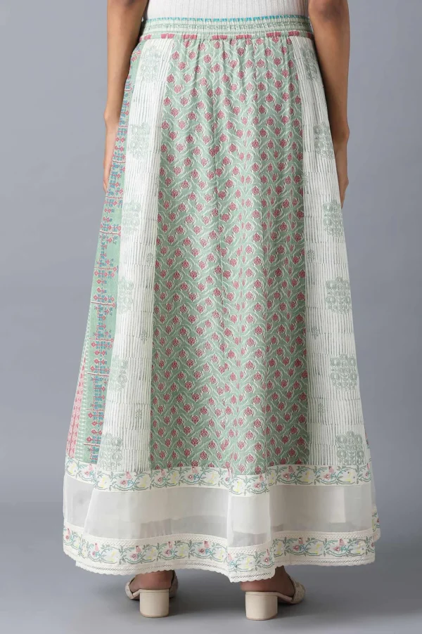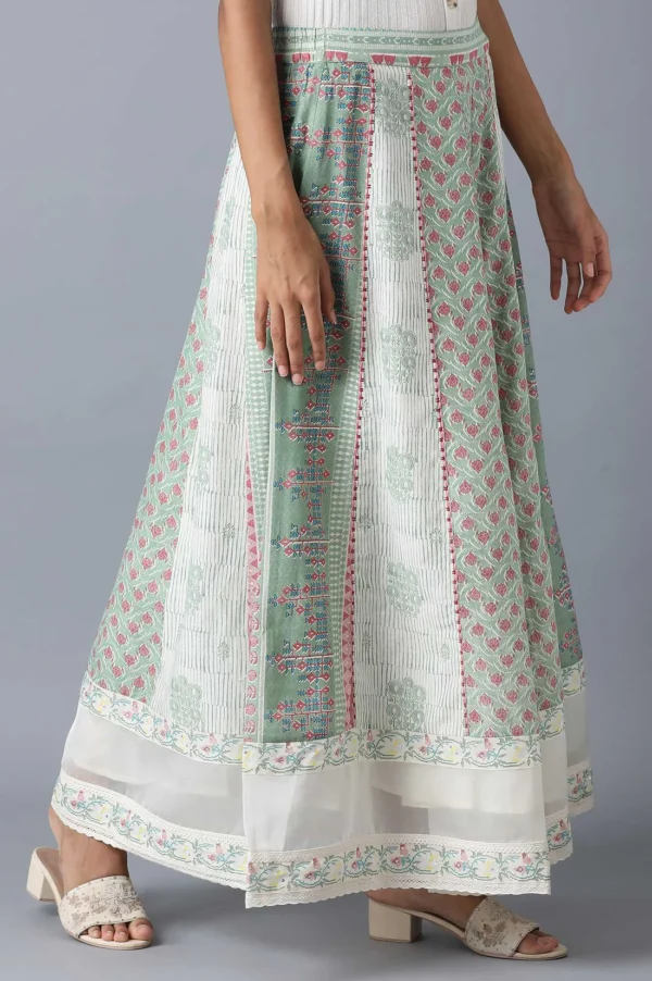 Pastel green-coloured print mix panelled skirt with embroidered organza border at hemline.