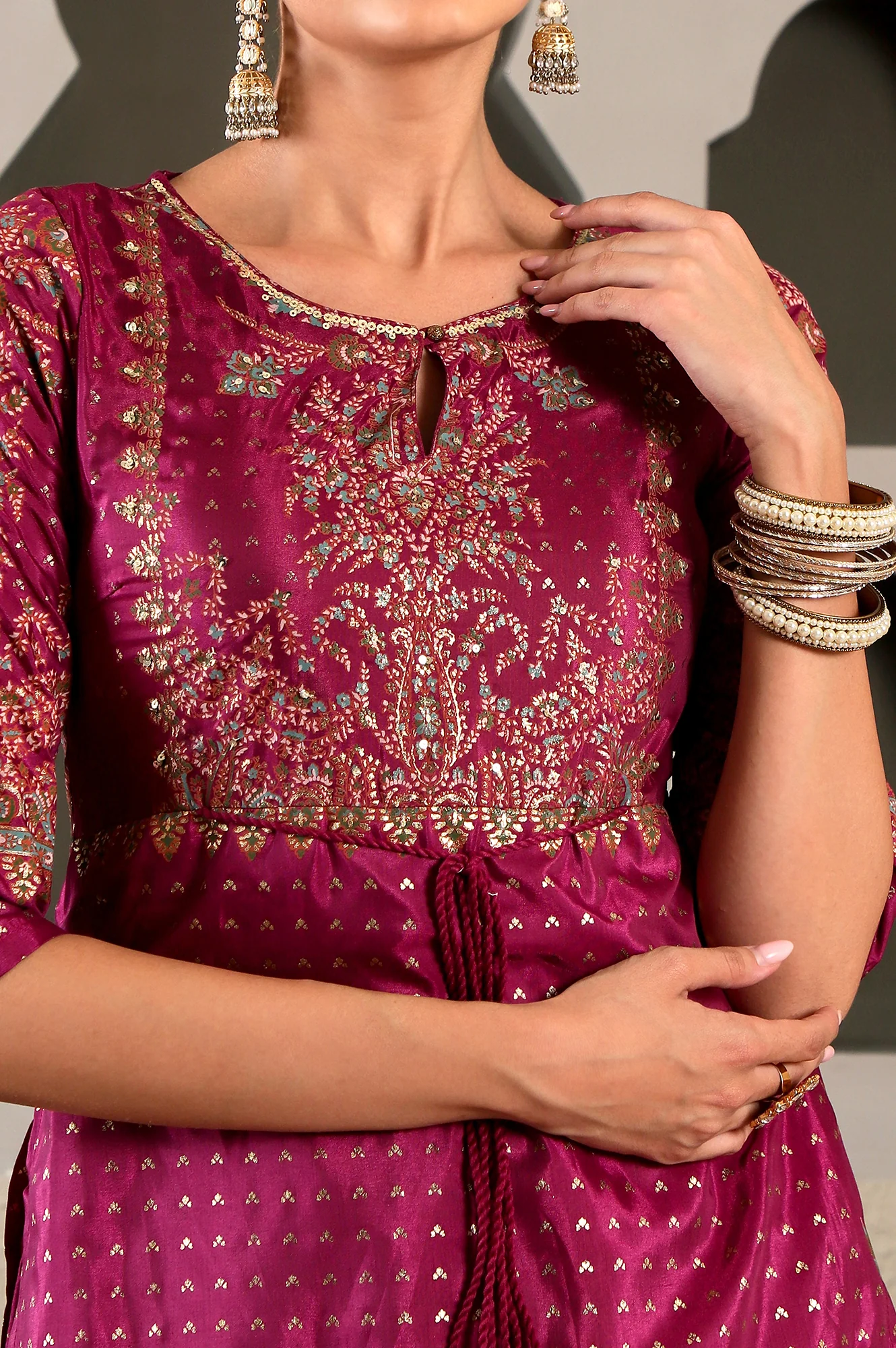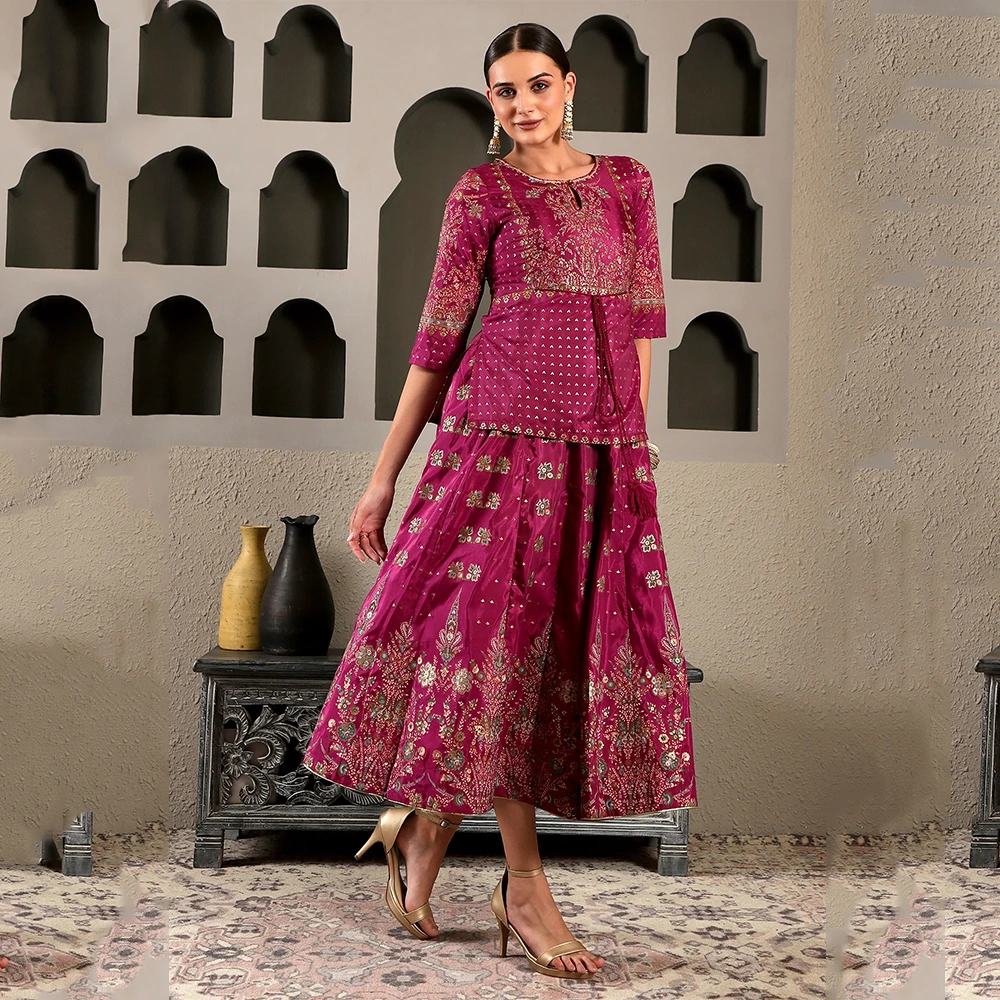 Be the show stopper at any evening party or celebration with this stylish and new fashion W’s duo dress. This beautiful grape coloured flared dress is a must-have for your wardrobe. It is adorned with glitter floral print all over and round neckline with embellished button closure. This trendy dress is designed in the style of attached top and skirt. Crafted in shantung fabric this dress also featured dori tie-up on sides.